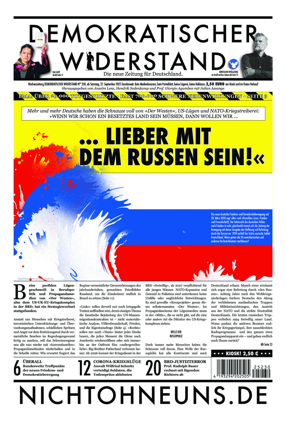 Aufklärungsarbeit: Wer sich nur einen groben Überblick über die Errungenschaften der DW-Redaktion verschaffen möchte, wird ab Ausgabe 57 im freien Archiv mit der Verzögerung von einer Woche alle Ausgaben als E-Paper finden – sofern das Internet noch halbwegs unzensiert bleibt. Das Titelblatt und einzelne Artikel werden aktuell als kostenloses Audio sowie als kostenloser Schriftartikel auf unsere Online-Seiten gestellt. Bitteschön, gern geschehen! Wer aber den Widerstand aktuell und komplett lesen will, sollte ein Print-Abonnement in Erwägung ziehen oder sogar als Verteiler aktiv werden. Das ist nicht nur für die Redaktion hilfreich, es ist auch ein weitaus besseres Erlebnis als die endlose Bildschirm-Klickerei.